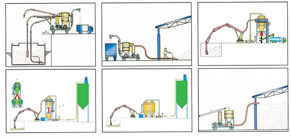 風機進口產生一定負壓力物料從吸嘴吸入,運送到分離器,物料在重力作用下進入卸料器,在電機帶動下均勻供料。風機出口產生一定壓力的高壓氣體,攜帶物料運送到指定位置。